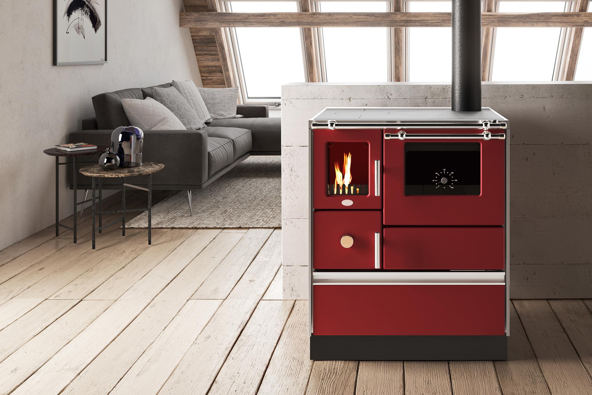 Stufa a legna con camera di combustione in pietra refrattaria. Corpo in acciaio con vassoio e porta a doppio vetro. Cassetto cenere estraibile per la raccolta della cenere in un vano separato. Attacchi per la canna fumaria in alto a destra, laterale a destra e posteriore a destra.