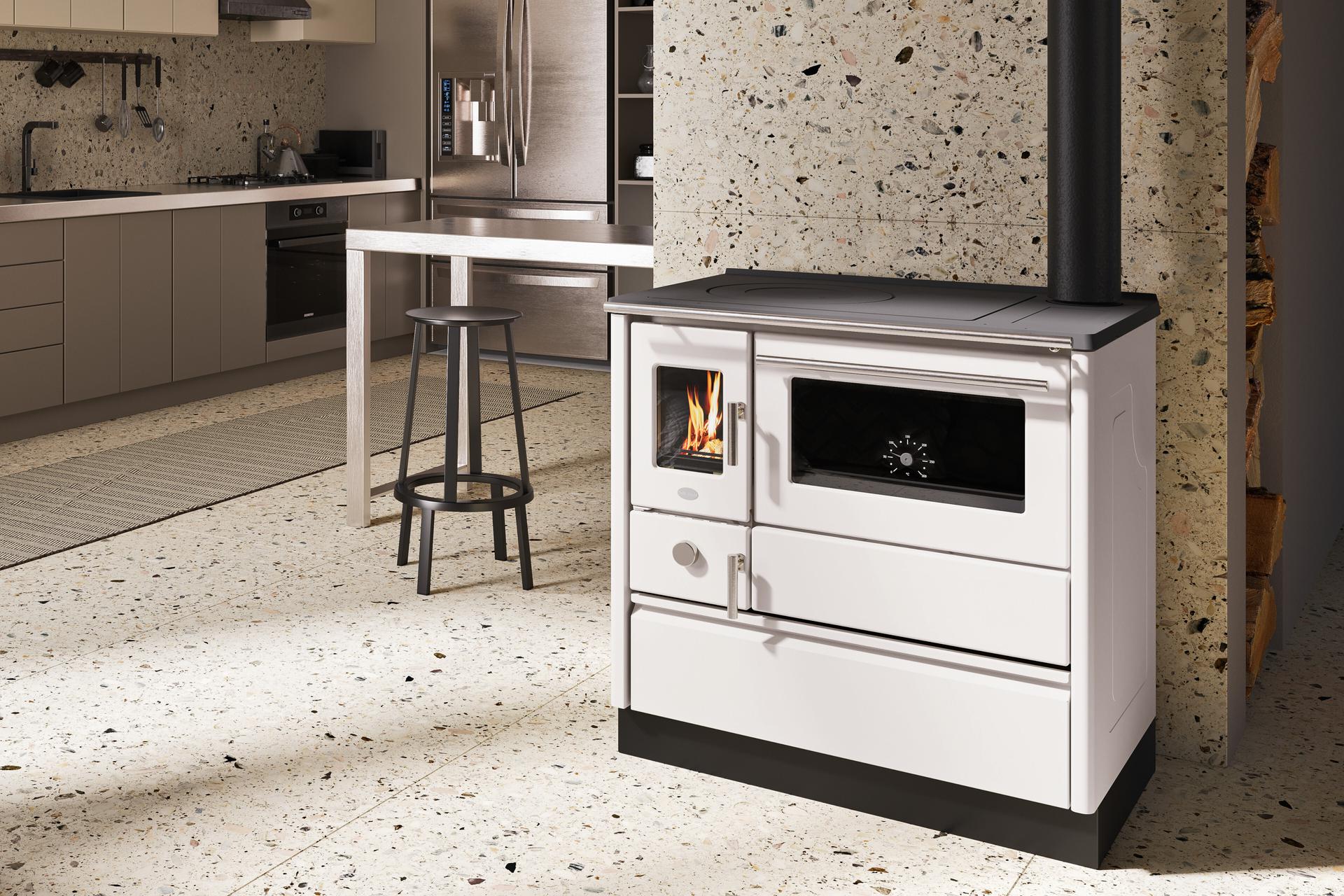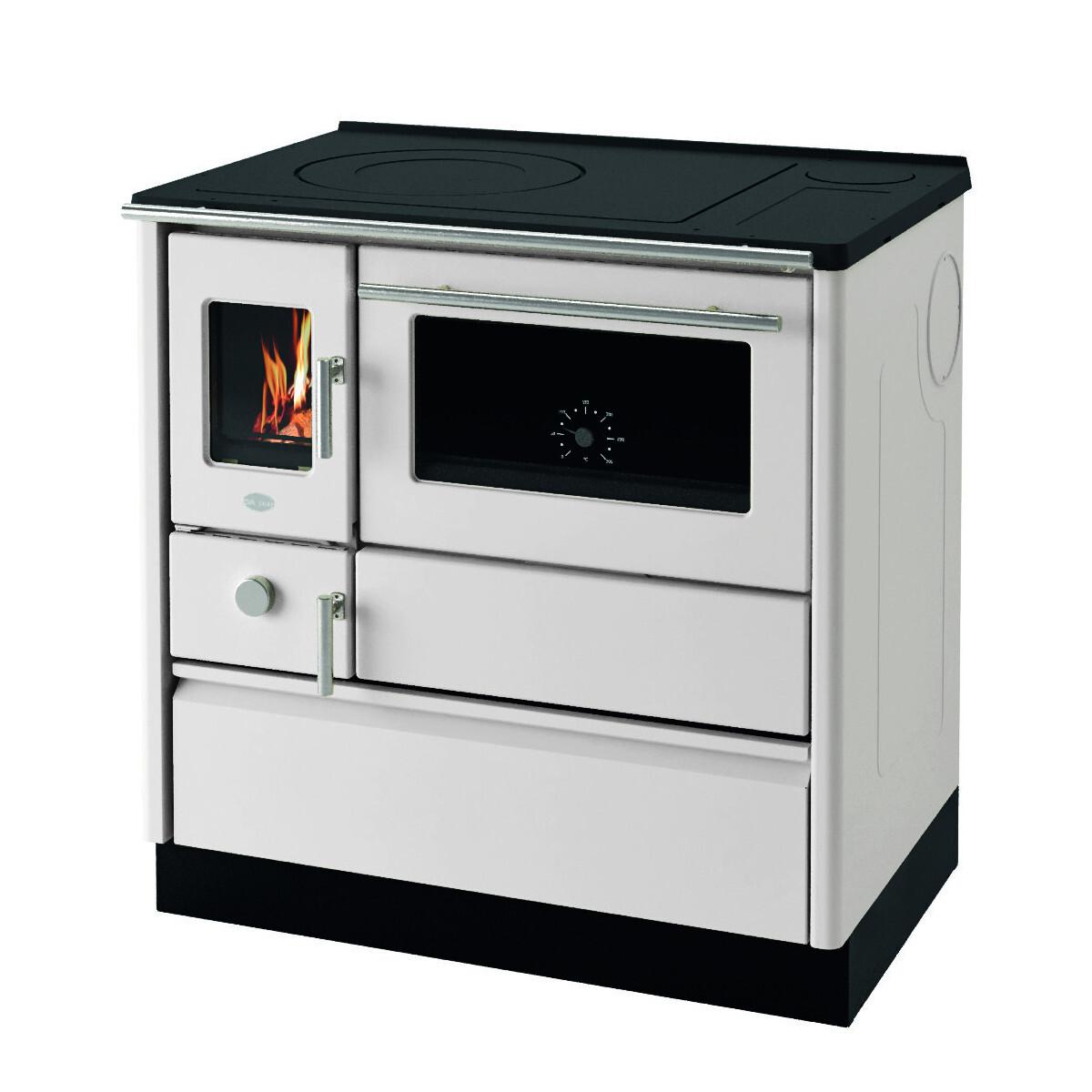 Cucina a legna con camera di combustione in ghisa. Corpo in acciaio con vassoio e porta a doppio vetro. Cassetto cenere estraibile per la raccolta della cenere in un vano separato. Attacchi per la canna fumaria in alto a destra e lateralmente a destra.