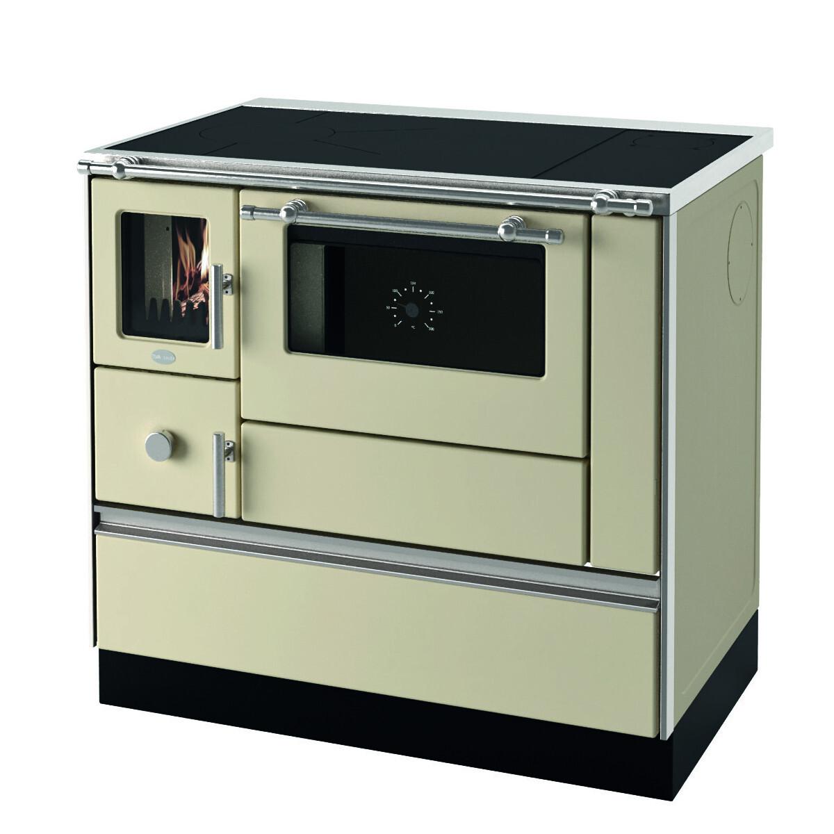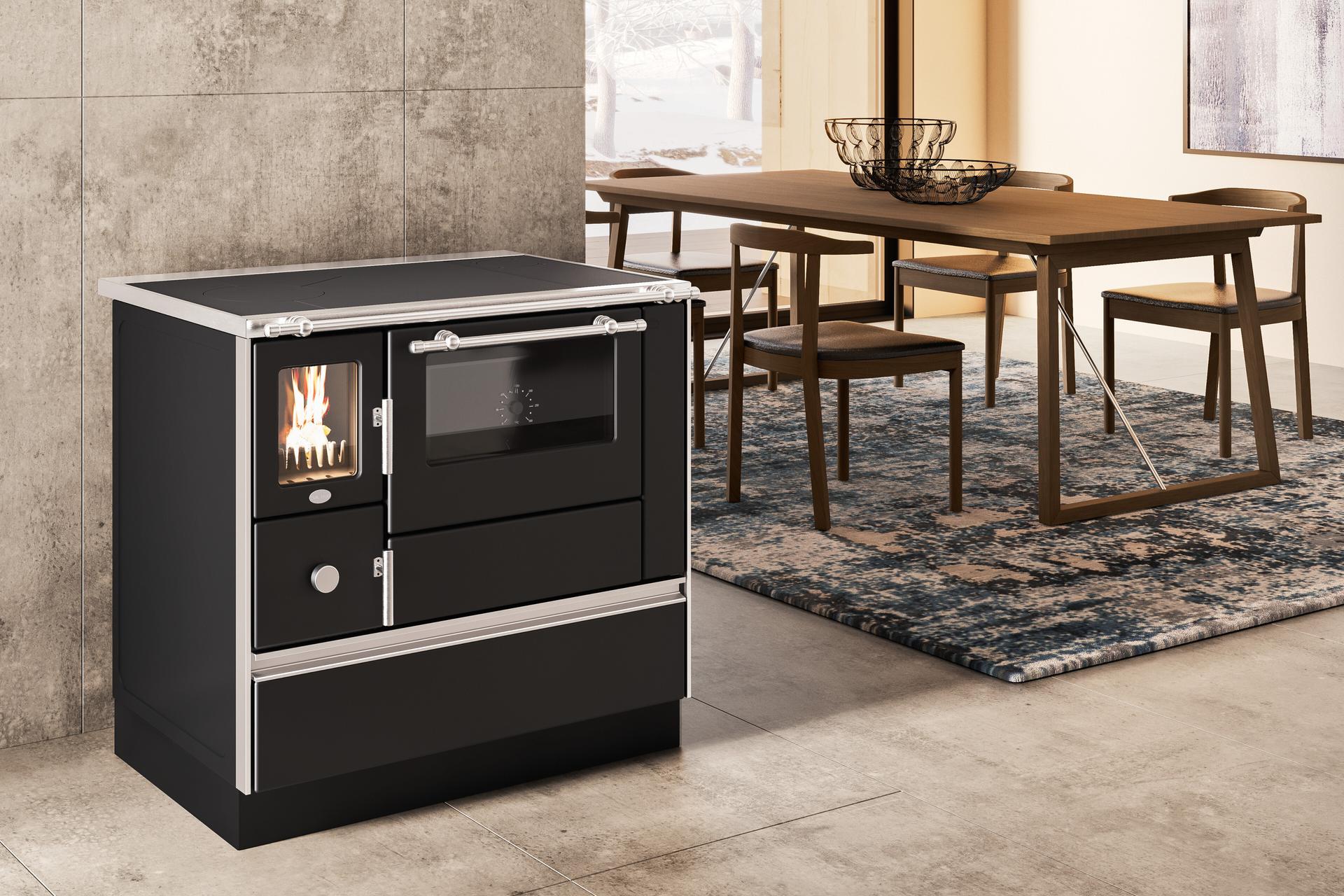Stufa a legna con camera di combustione in pietra refrattaria. Corpo in acciaio con vassoio e porta a doppio vetro. Cassetto cenere estraibile per la raccolta della cenere in un vano separato. Attacchi per la canna fumaria in alto a destra, laterale a destra e posteriore a destra.