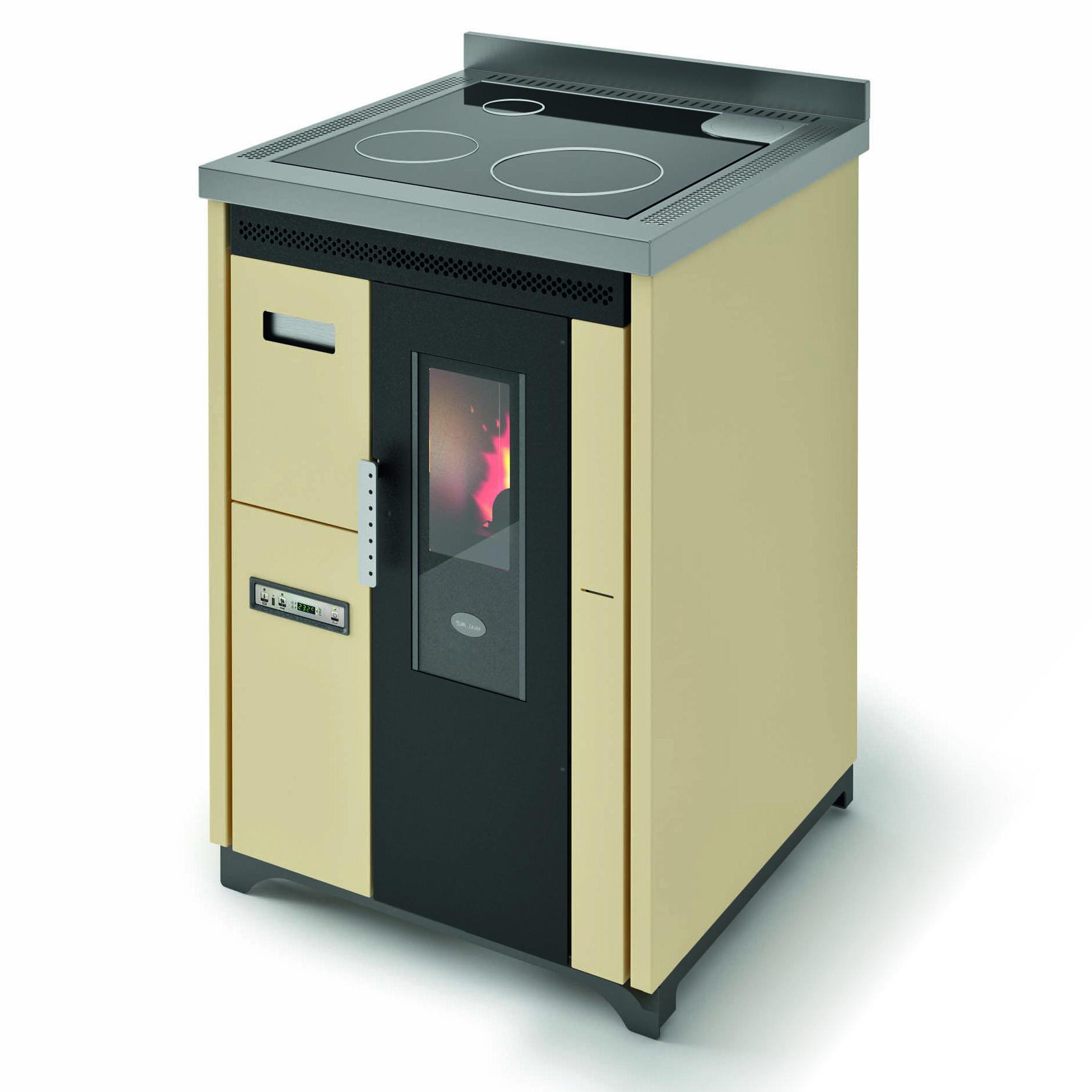 Cucina a pellet con piastra di cottura in vetroceramica. La ventilazione forzata per la distribuzione del calore può essere disattivata se non necessaria, ad esempio in estate. Cassetto frontale estraibile per facilitare il caricamento del pellet. 10 (5+5) livelli di potenza gestibili tramite il display del menu, disponibile in 6 lingue. Termostato di sicurezza e manostato con possibilità di collegare un termostato esterno. Attacchi per la canna fumaria posteriore e superiore per meglio adattarsi alle esigenze di installazione.