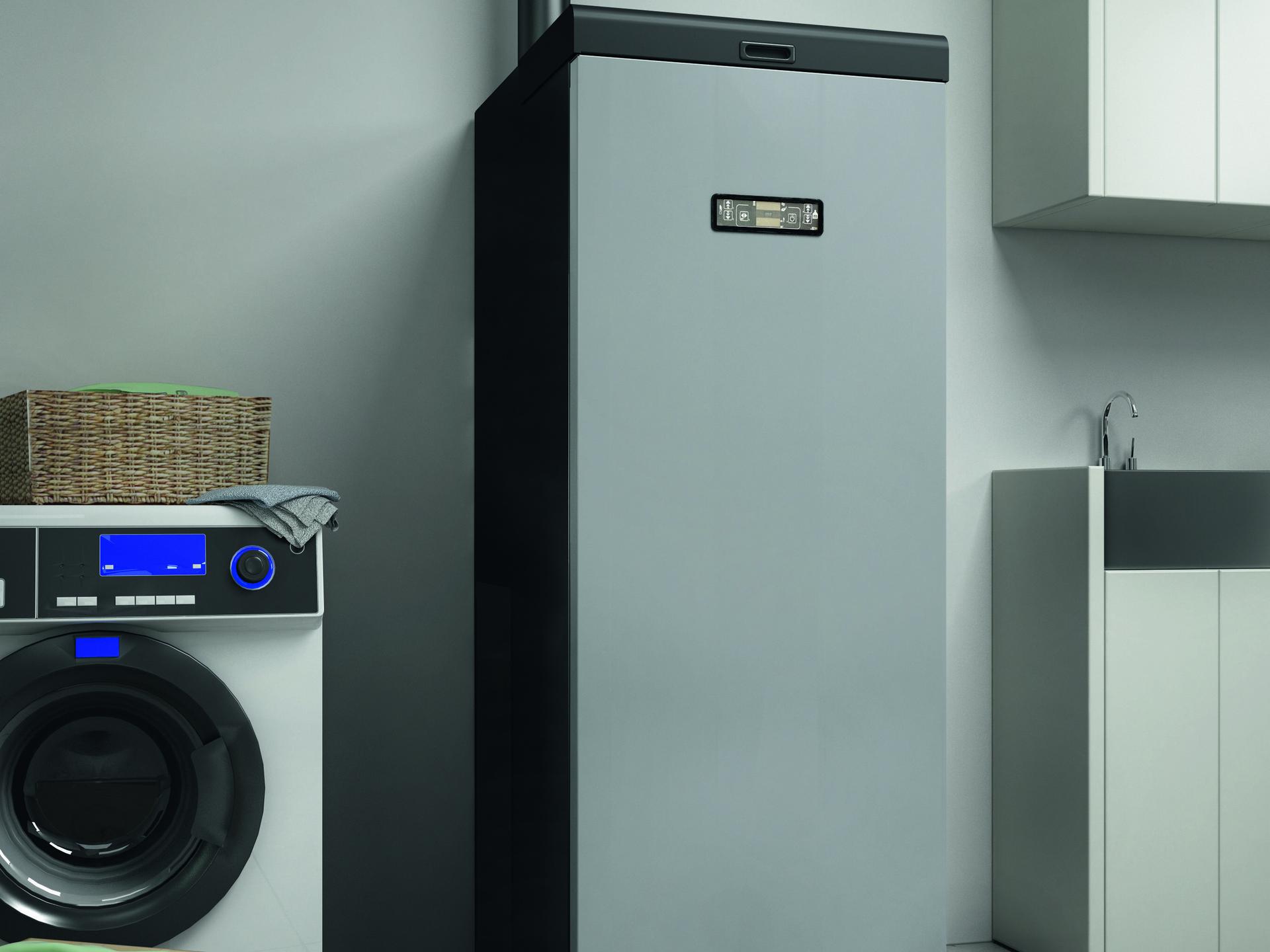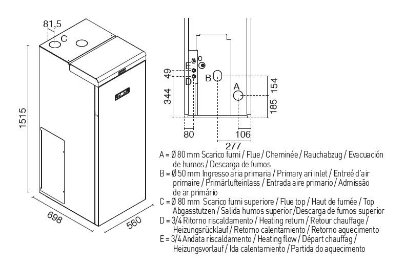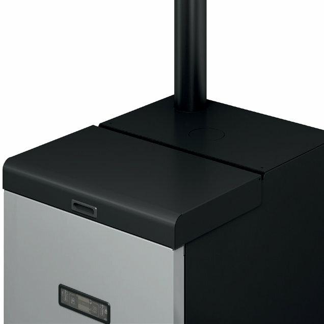 Caldaia a pellet a doppia porta a bassa manutenzione. Il suo design compatto e la possibilità di collegare la canna fumaria sul retro o sulla parte superiore ne consentono l'installazione in spazi limitati.