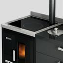 Cucina a pellet da incasso con piastra di cottura in vetroceramica. La ventilazione forzata per la distribuzione del calore può essere disattivata quando non è necessaria, ad esempio in estate. Cassetto frontale estraibile per facilitare il caricamento dei pellet. 10 (5+5) livelli di potenza gestibili tramite il display del menu, disponibile in 6 lingue. Termostato di sicurezza e manostato con possibilità di collegare un termostato esterno. Attacchi per la canna fumaria posteriore e superiore per meglio adattarsi alle esigenze di installazione.