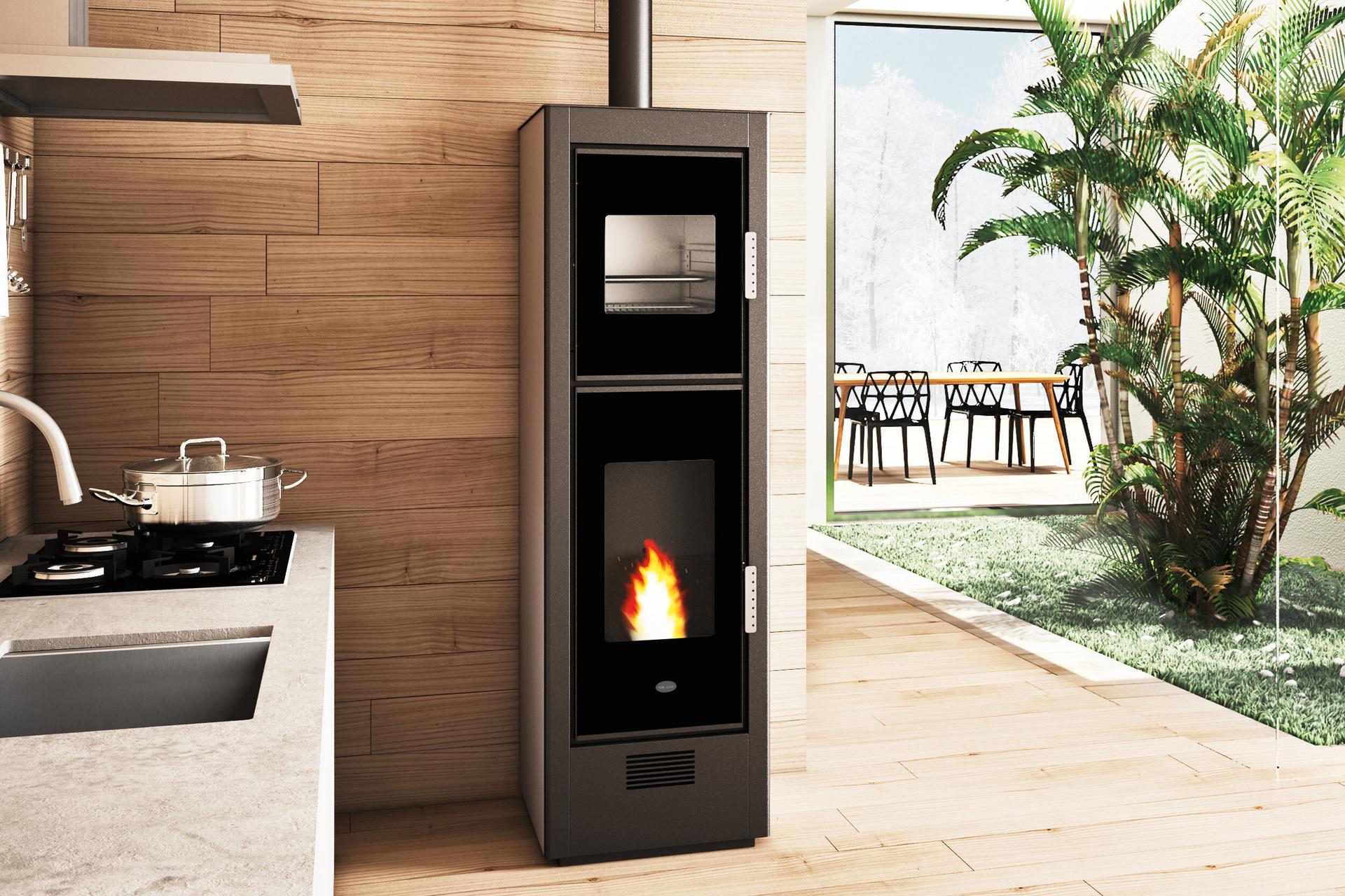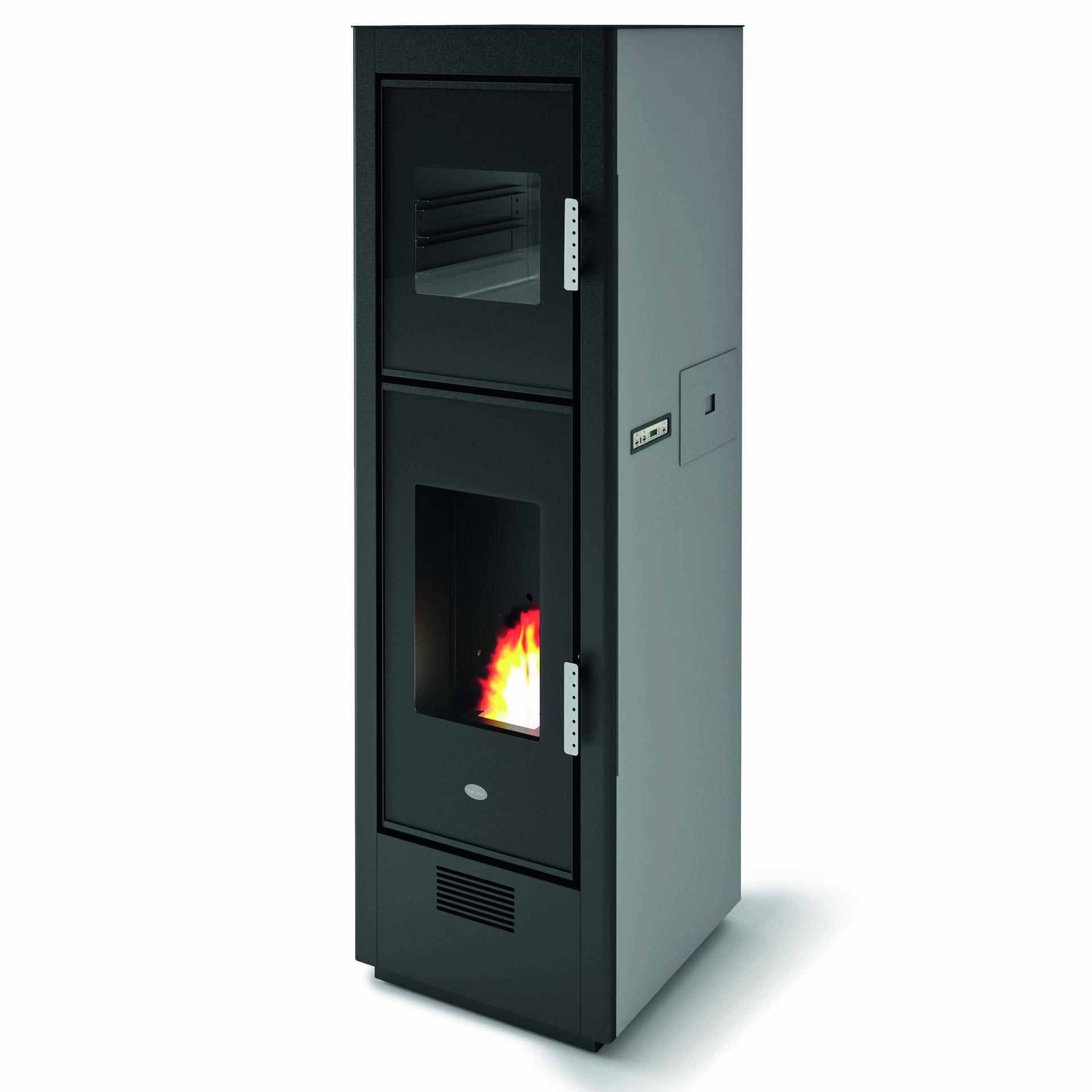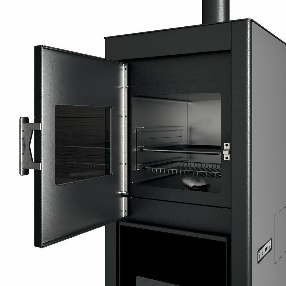 Riscaldamento e cottura con un'unica stufa a pellet. Design compatto ed elegante con attacchi per la canna fumaria posteriore e superiore per una facile integrazione nello spazio abitativo. Ampie porte con vetro stampato nero. Il forno in acciaio inox è dotato di guide porta teglie rimovibili, teglia in alluminio e griglia porta teglie. La temperatura di cottura è controllata da un display con un intervallo compreso tra 120 e 240°C. 5 livelli di potenza sono gestiti dal display del menu in 6 lingue.