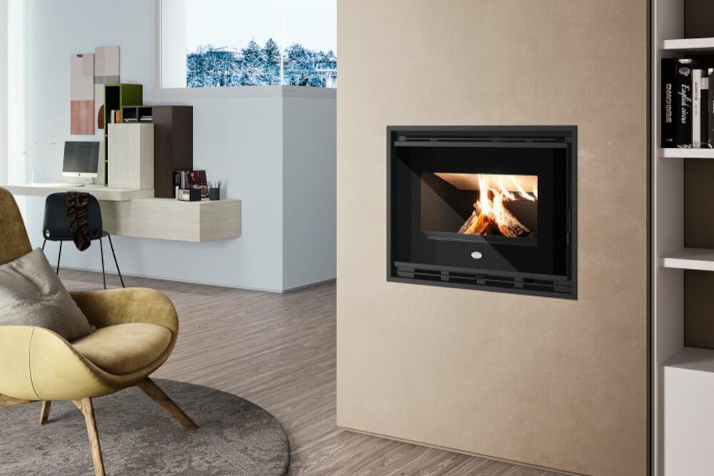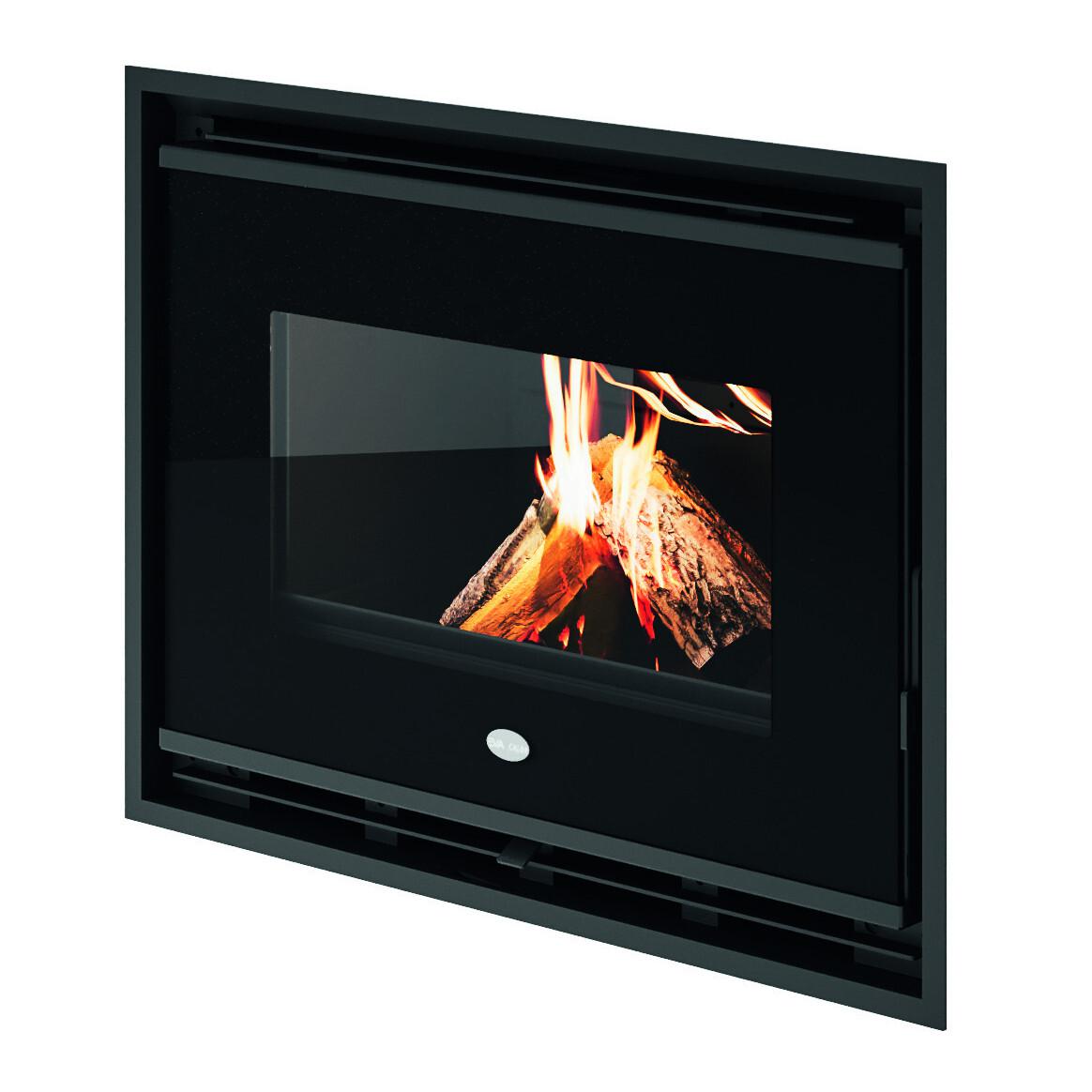 Inserto a legna con camera di combustione in vermiculite. Design lineare con porta frontale in vetro nero serifgrafato e maniglia rimovibile.
