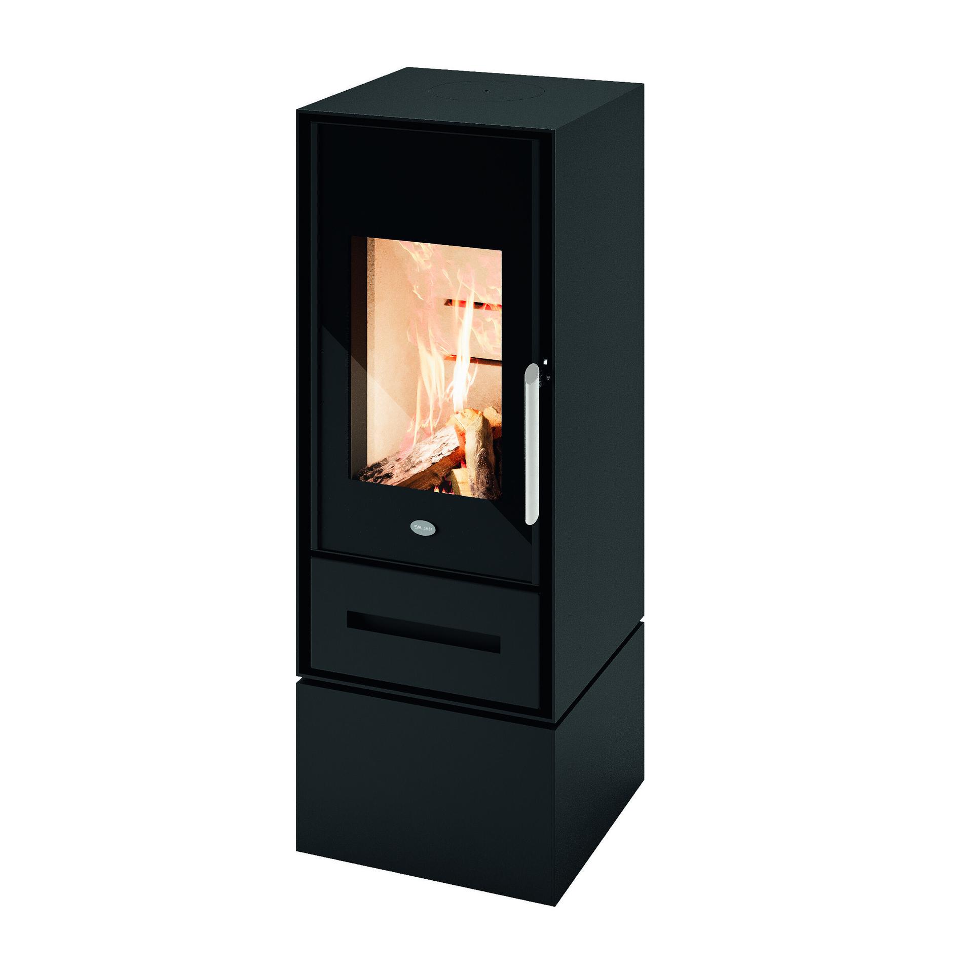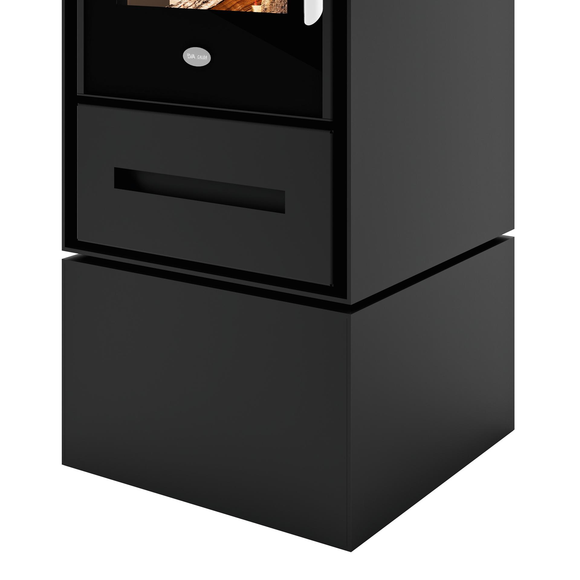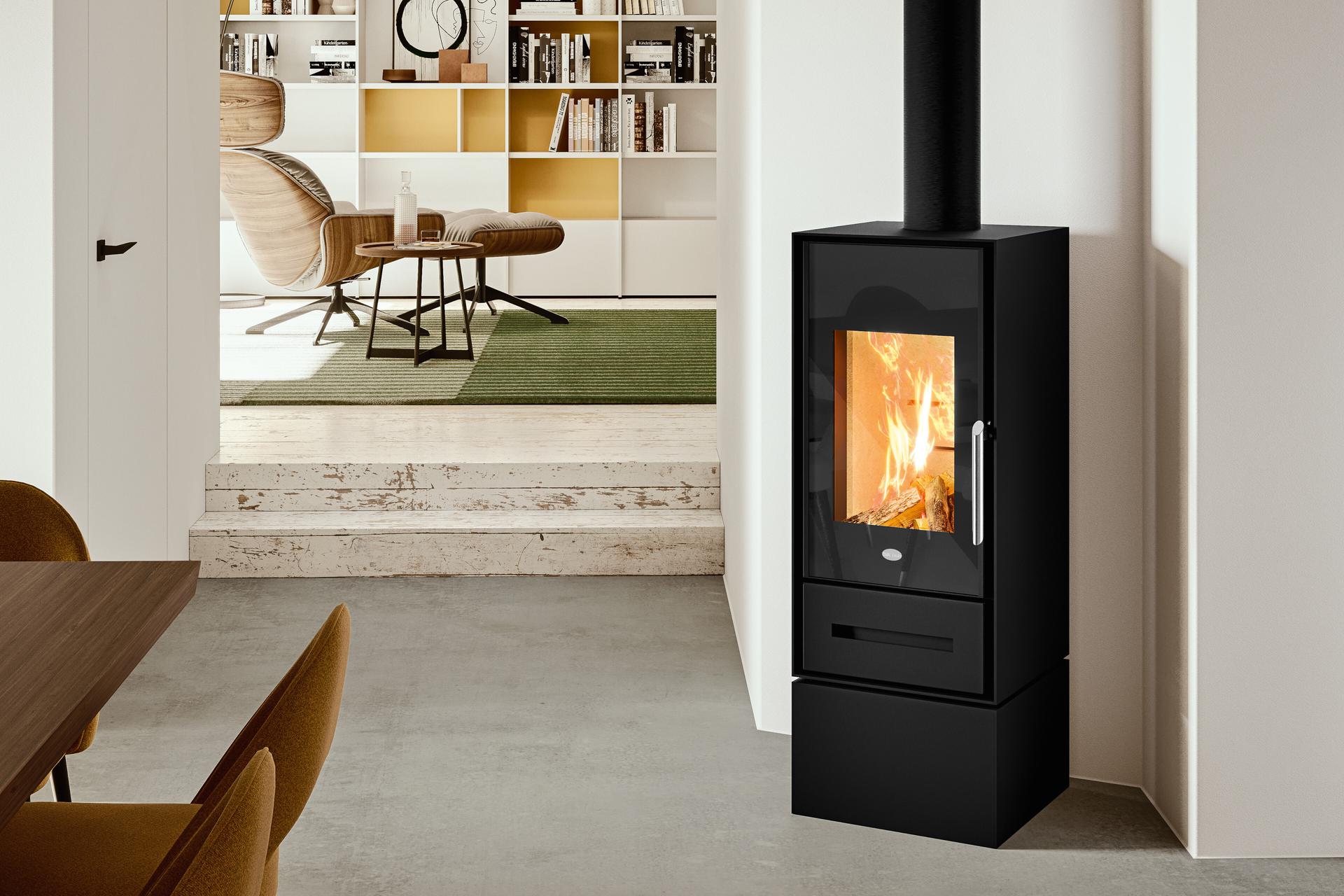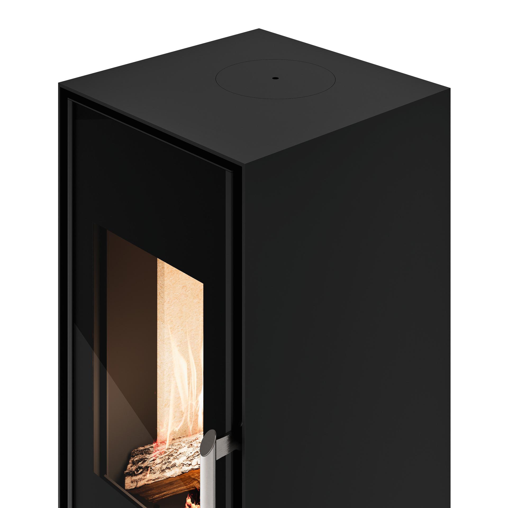 Design moderno e lineare con porta in vetro frontale serigrafato nero e piastra con spessore di 5 mm. Stufa ermetica con camera di combustione in vermiculite e controllo dell'alimentazione dell'aria. Cassetto cenere estraibile per la raccolta della cenere in un vano separato. Attacchi per la canna fumaria sulla parte superiore e posteriore.
