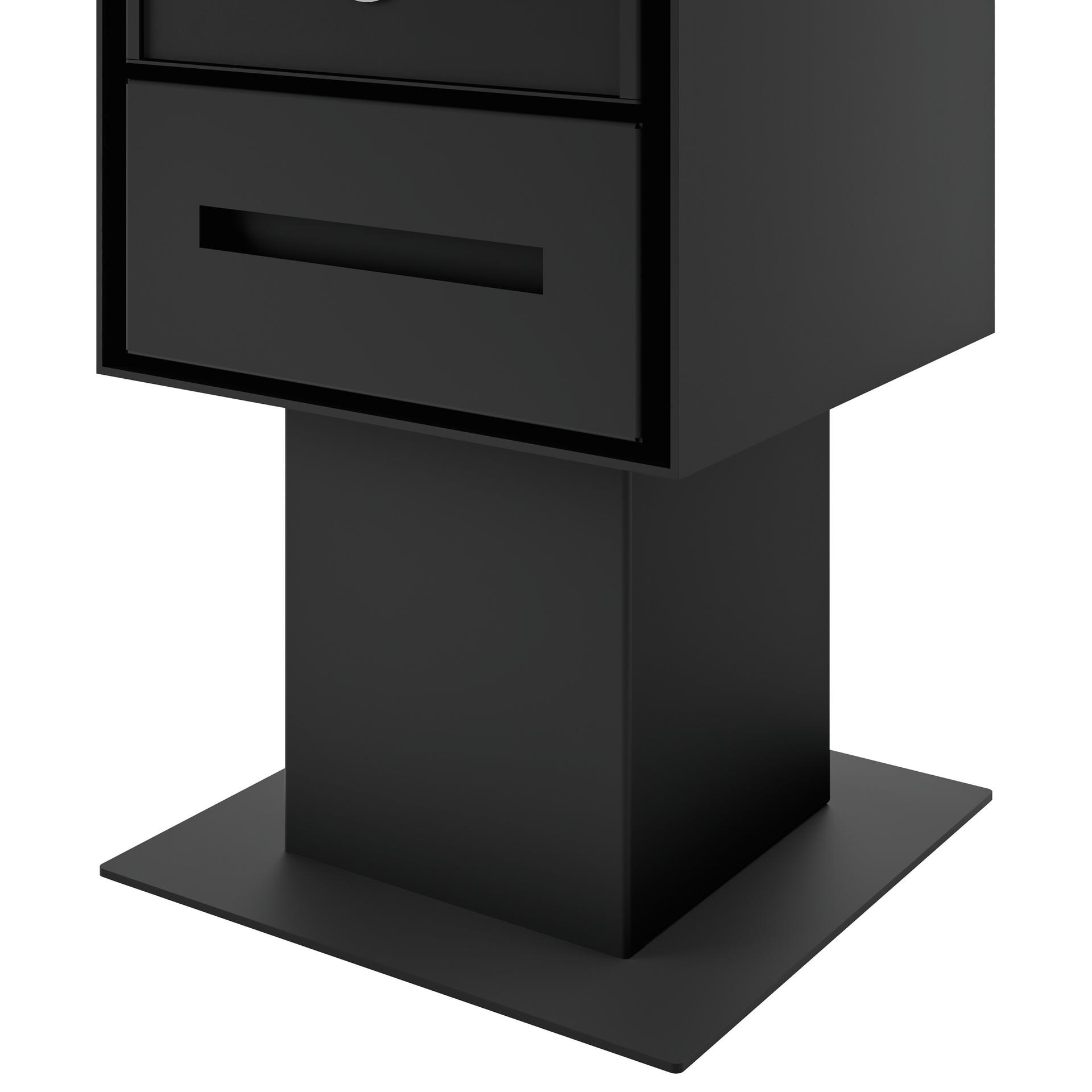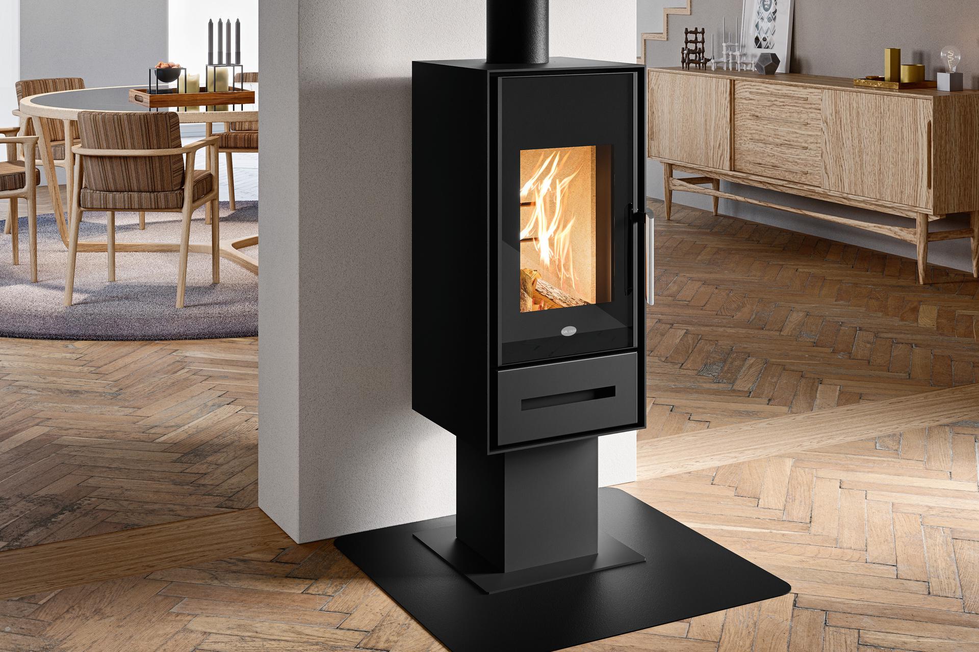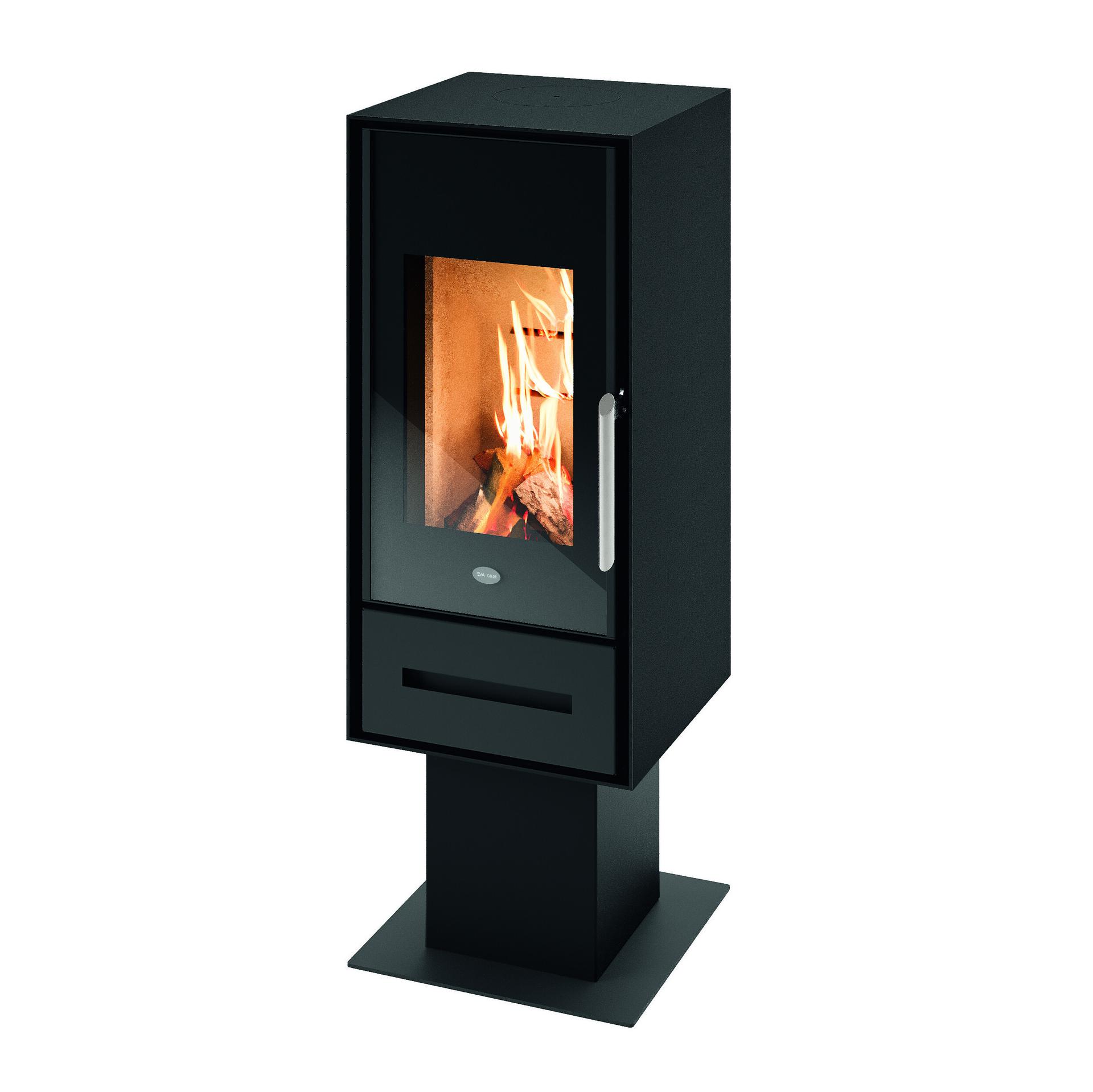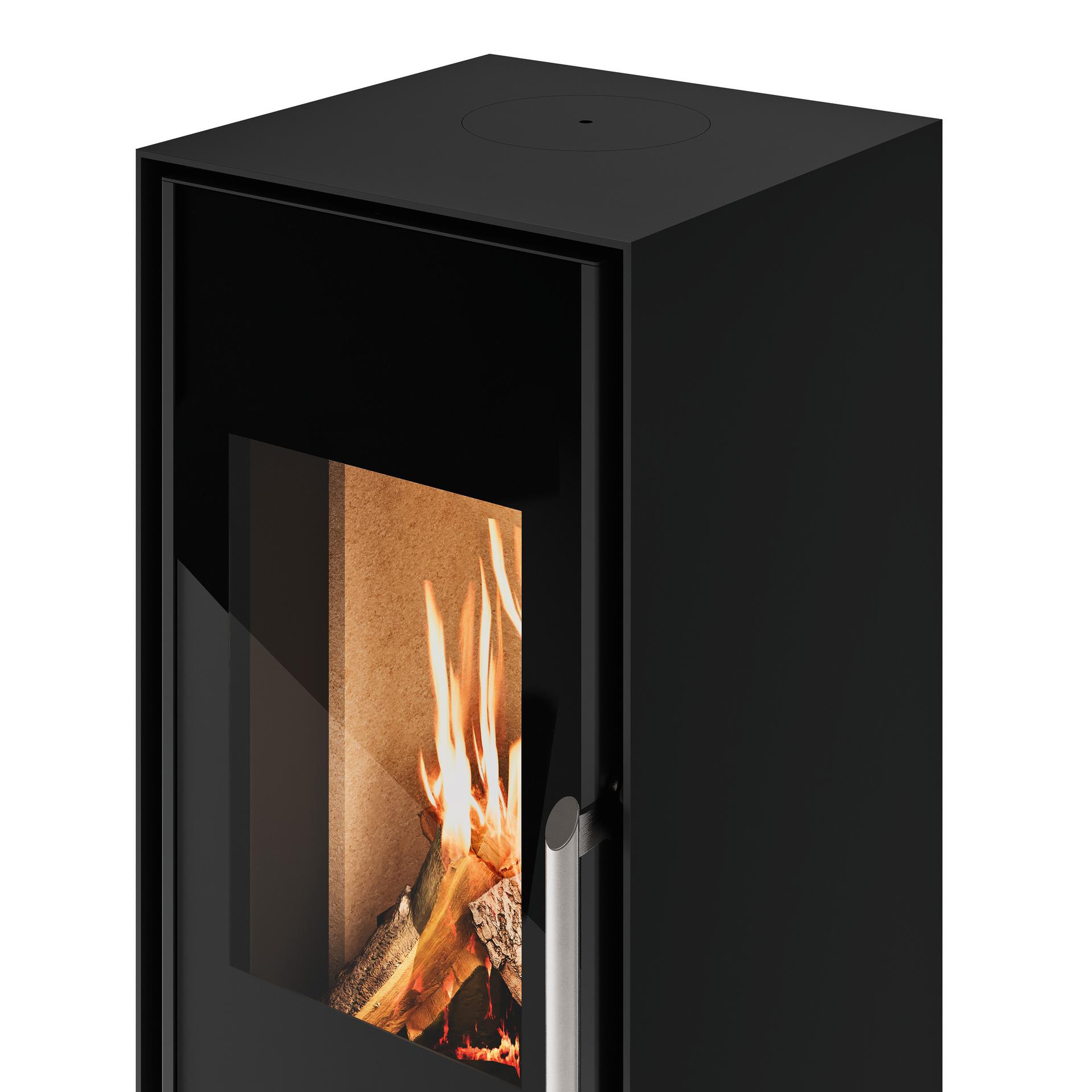 Design moderno e lineare con porta frontale in vetro nero serigrafato, piastra di 5 mm di spessore ed elegante basamento. Stufa a camera stagna con camera di combustione in vermiculite e controllo dell'alimentazione dell'aria. Cassetto cenere rimovibile per la raccolta della cenere in un vano separato. Attacchi per la canna fumaria superiore e posteriore.