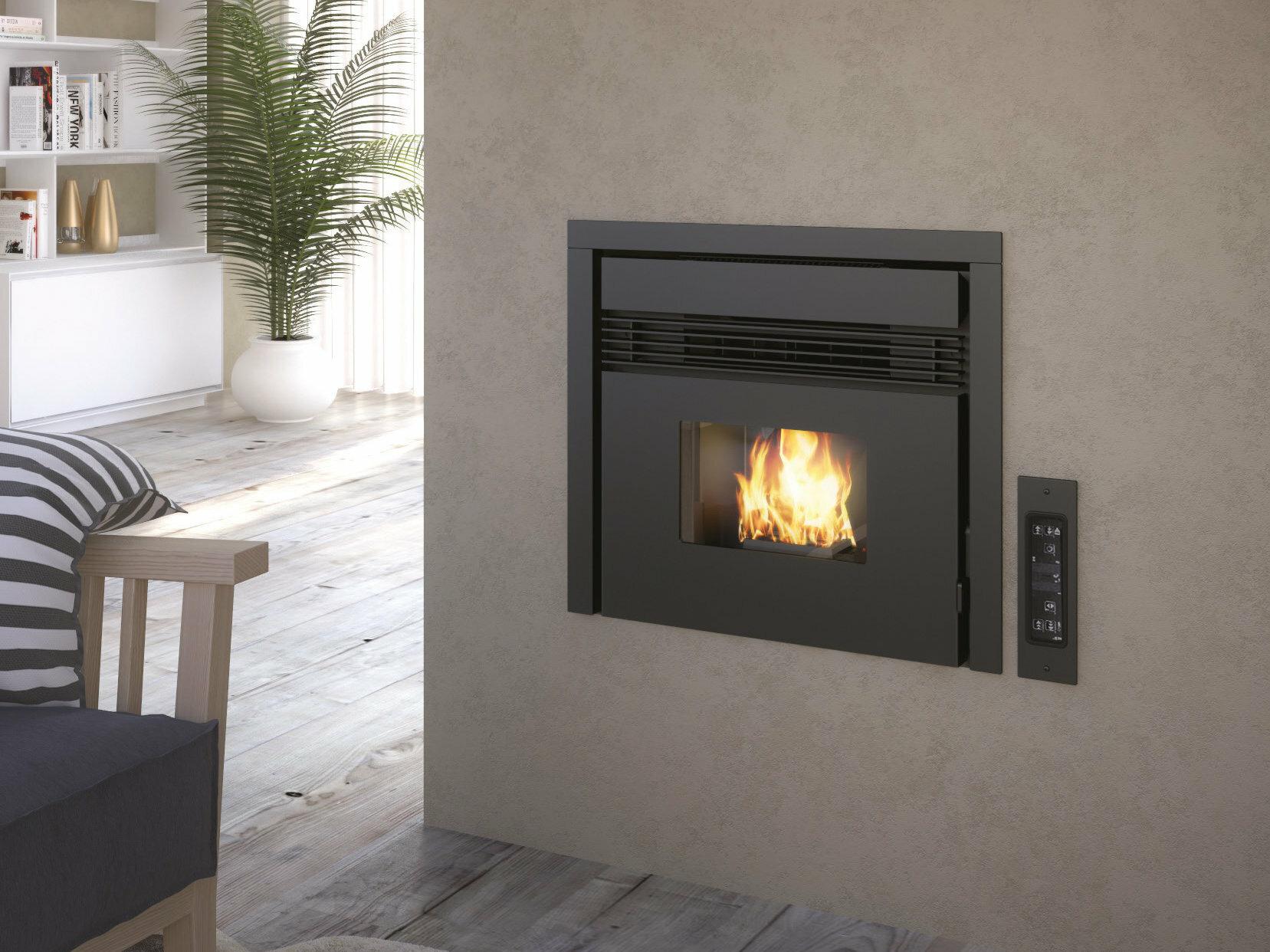 Inserto a pellet con ventilazione frontale dal design essenziale.