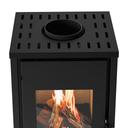 Design compatto ed essenziale con involucro in acciaio e cassetto porta legna. Camera di combustione in vermiculite e regolazione dell'aria di combustione. Cassetto cenere estraibile per la raccolta della cenere in un vano separato. Connessione alla canna fumaria nella parte superiore.