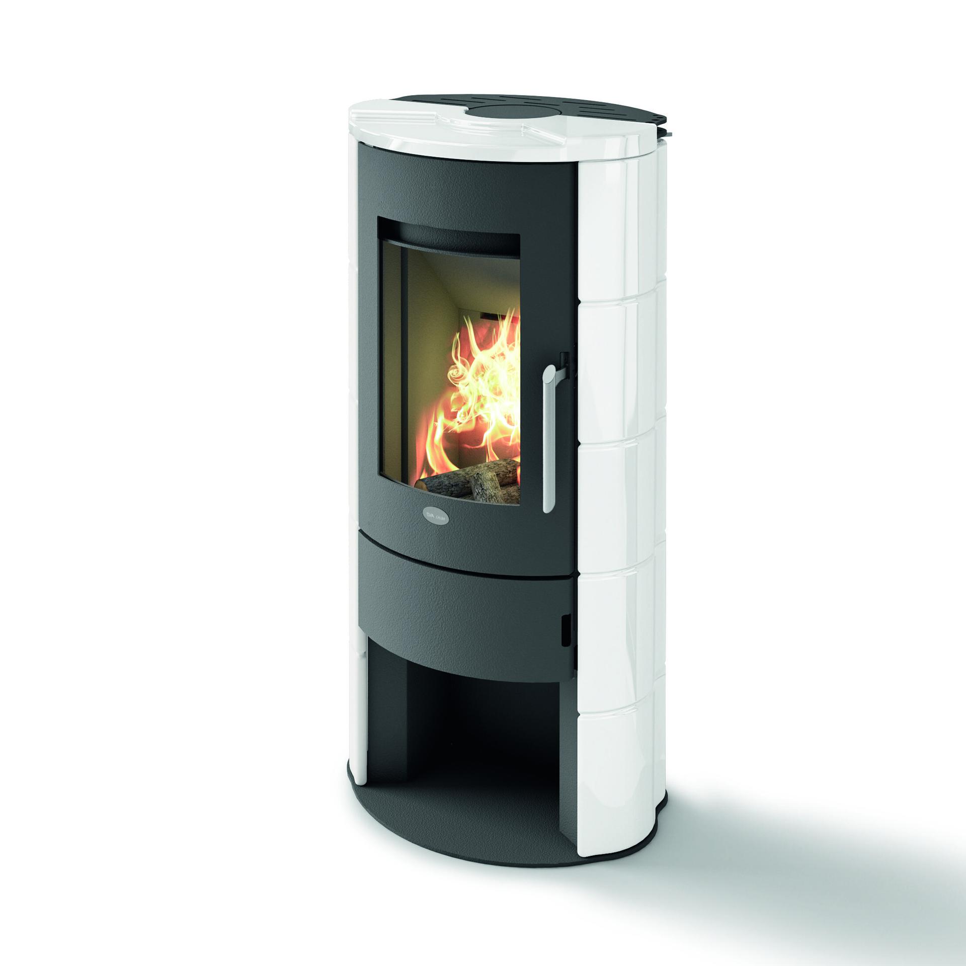 Stufa a legna con porta curva, top di spessore 6 mm e rivestimento in maiolica. Camera di combustione in vermiculite e controllo dell'alimentazione dell'aria. Cassetto cenere estraibile per la raccolta della cenere in un vano separato. Attacchi per la canna fumaria sulla parte superiore e posteriore.