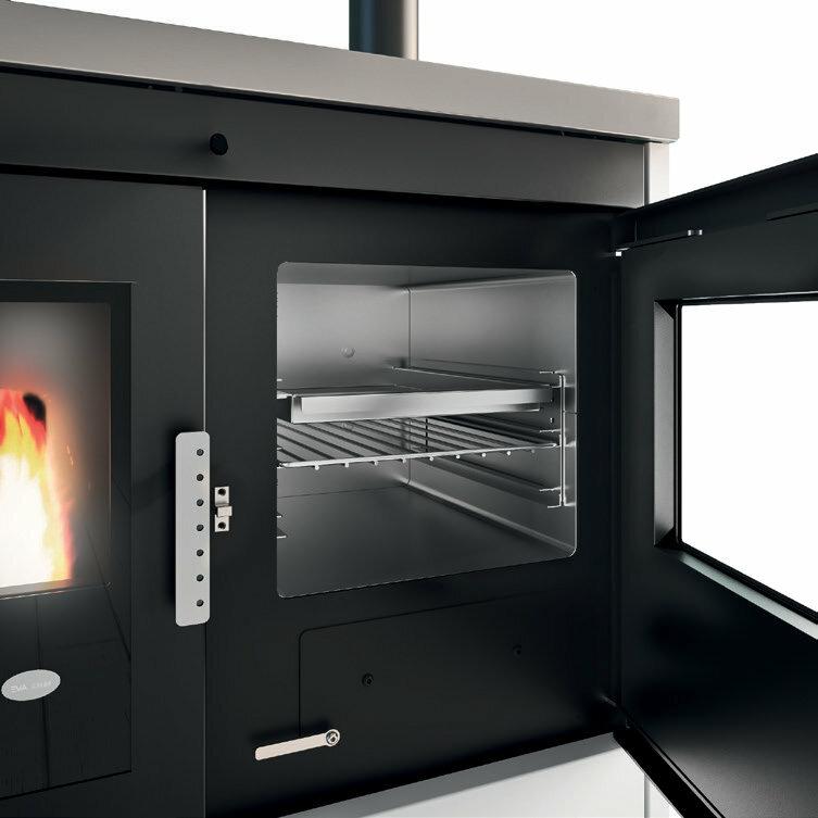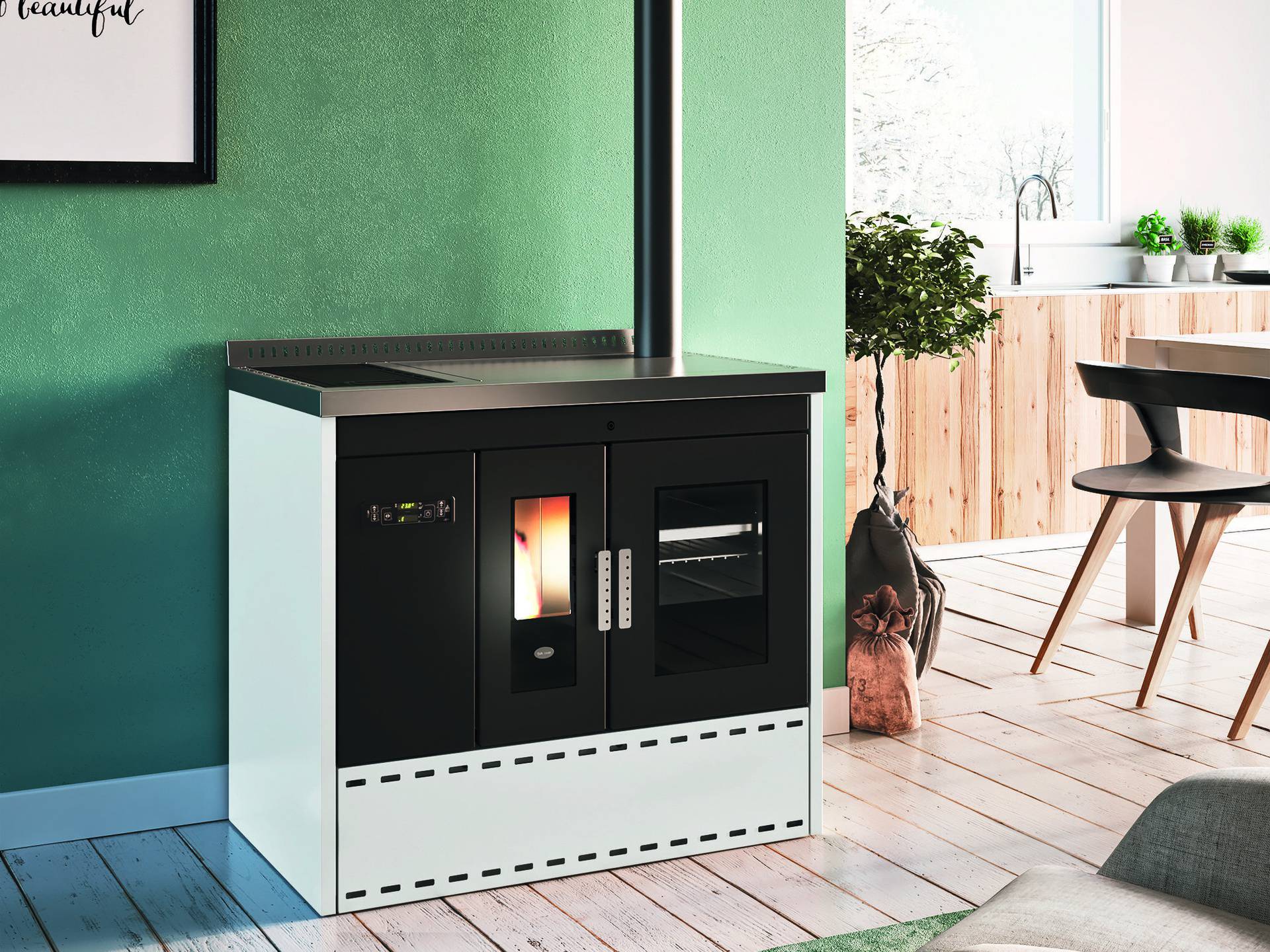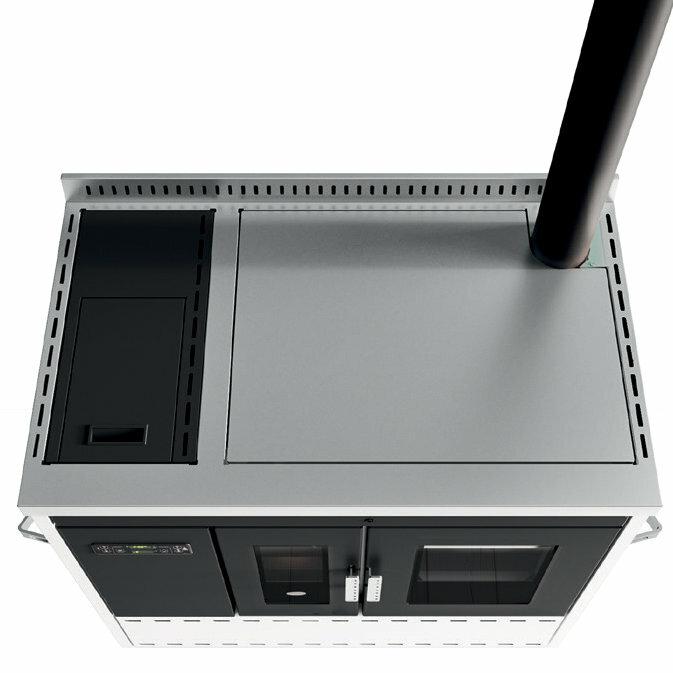 Riscaldamento centralizzato, cottura e sfornate in tutta comodità con un'unica cucina a pellet. Il design lineare, la porta anteriore in vetro nero acidato e la possibilità di collegare la canna fumaria alla parte posteriore o superiore rendono questa cucina a pellet facile da integrare nella vostra casa. Il forno in acciaio inox con illuminazione e resistenza è dotato di guide porta teglie rimovibili, di un vassoio in alluminio e di una griglia porta teglie. La temperatura di cottura è regolata da un display con un intervallo compreso tra 120 e 240°C. 5 livelli di potenza sono gestiti dal display con menu in 6 lingue. L'impianto idraulico è fornito con termostato e manostato di sicurezza, pompa di circolazione, vaso di espansione e valvola di sicurezza.