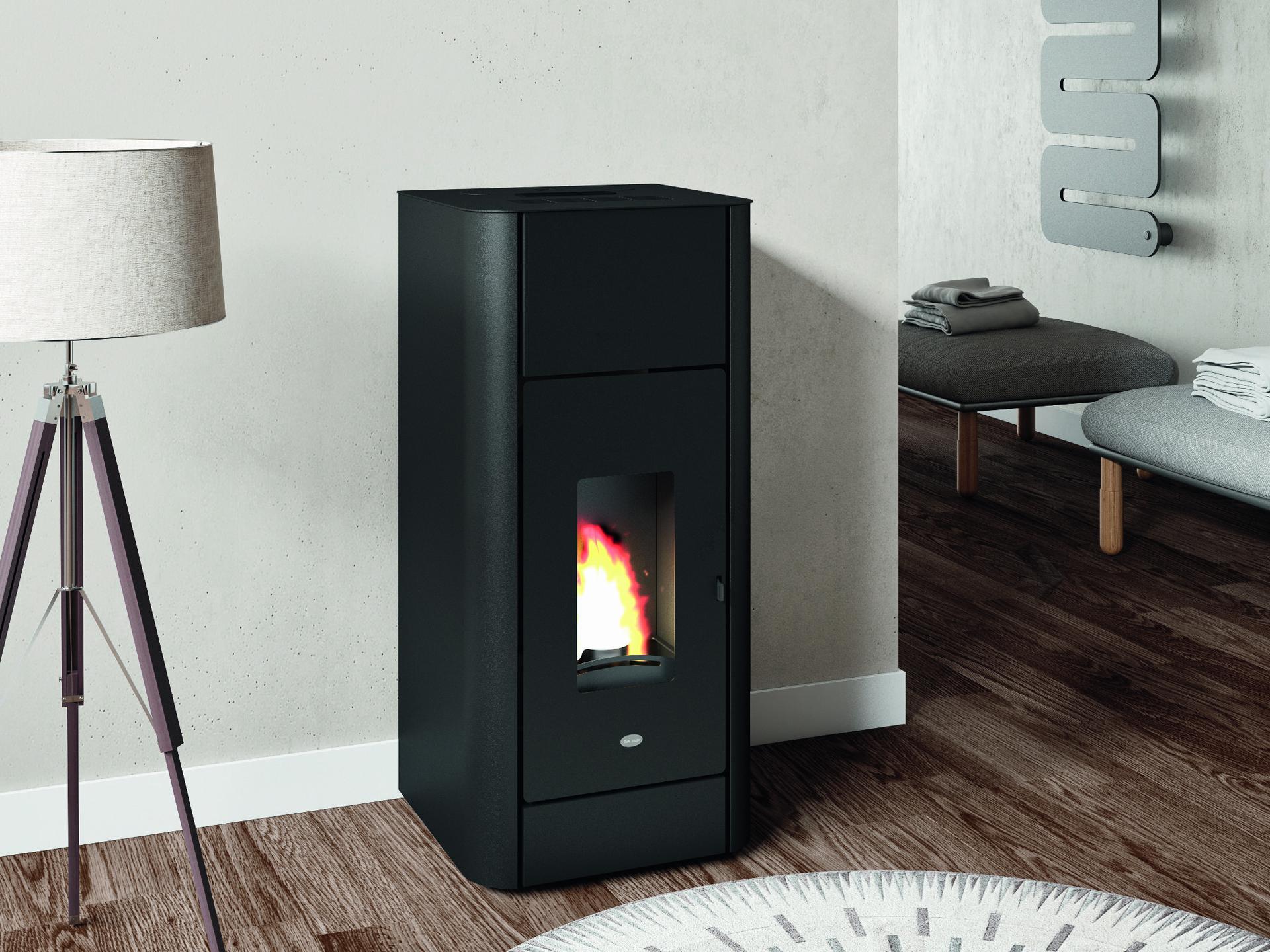 Termostufa a pellet con rivestimento in acciaio. La maniglia della porta è rimovibile.